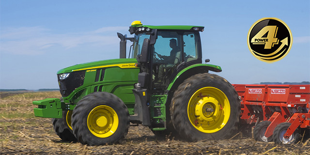 6R系列拖拉机采用约翰迪尔 PowerTechTM PSS 6068发动机。双可变几何尺寸涡轮增压器、每缸四气门的进排气系统加高压共轨燃油系统的配置使发动机动力表现强劲,响应速度更快。发动机的额定净功率达到240马力(*此额定净功率数值详见 GB 20891-2014),中重负荷作业效果更好。扭矩储备达到34%,可应对更复杂的作业情况,减少换挡频率,提升有效作业时间。后处理系统采用DOC+DPF+SCR+AOC的方案,在尿素参与下尾气处理效果好,满足国家排放要求。后处理系统可在不影响作业的情况下进行主动再生,需要维护的环节较少,为用户省时省力。后处理系统经过全球市场的多年实践,稳定可靠,让用户更安心。